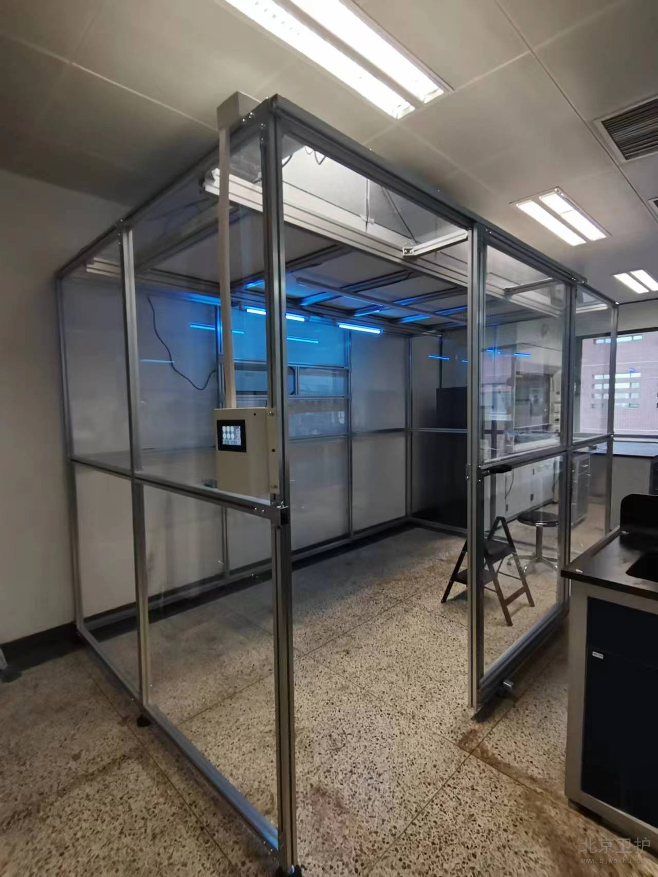 9月份我公司接到此項目后便抓緊時間出具相關(guān)方案、設計圖紙,經(jīng)過不斷的溝通和改動,最終確定施工方案。此單位潔凈棚設計面積20平米,主體材質(zhì)為鋁型材,隔離板使用亞格力板,頂部配有紫外線燈輔助殺菌,過濾系統(tǒng)為百級凈化模塊,并配有我公司研發(fā)的控制系統(tǒng)。從最初的方案設計、安裝施工,到最后的驗收,總工期為10個工作日。
