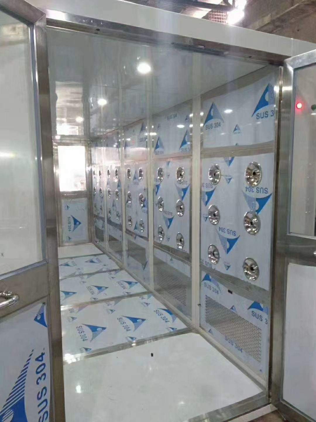 工作原理:經高效過濾器過濾后的潔凈氣流由可旋轉噴嘴從各個方向噴射至貨物上,從而有效而迅速地清除塵埃粒子。清除后的塵埃粒子再經由初、高效過濾器過濾后重新循環到風淋區域內。